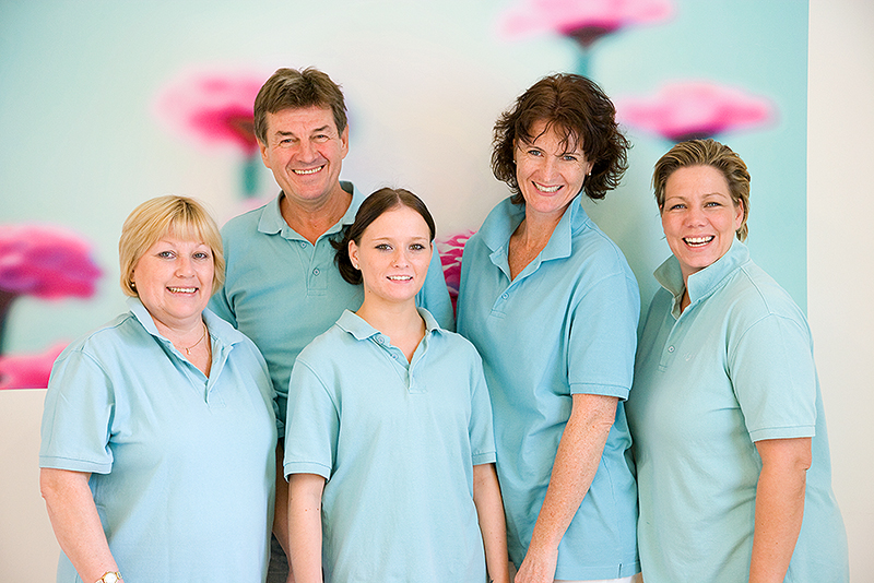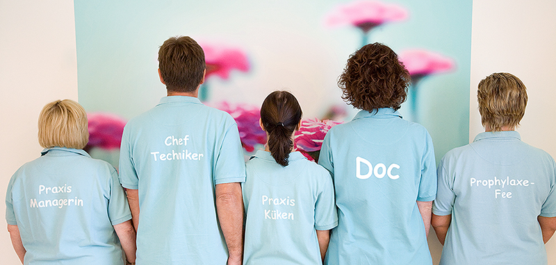 Gewünscht waren Aufnahmen des gesamten Team in der Praxis, Aufnahmen der Praxisräume, verschiedene Arbeitssituationen, sowie Einzelaufnahmen im Studio mit Hintergrund in CI-Farbe