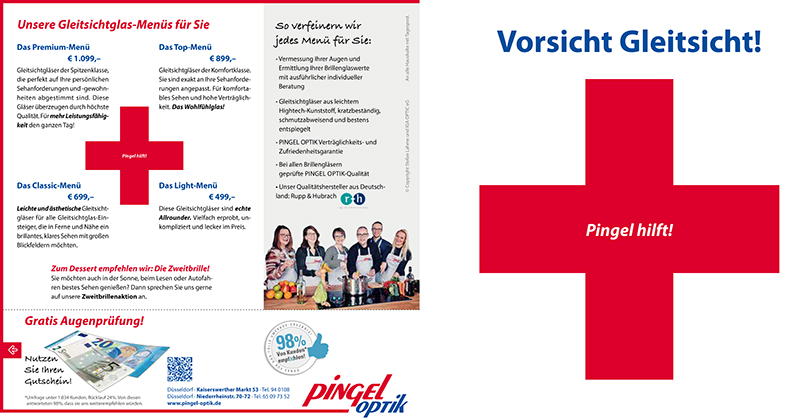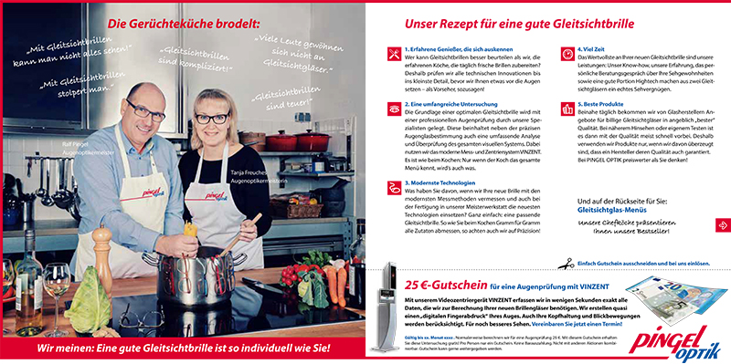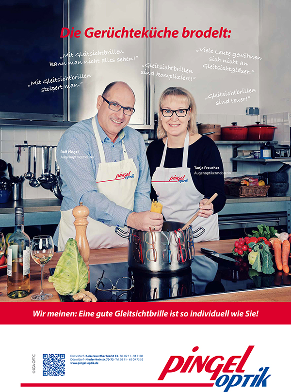 Eine neue Werbekampagne stand an. Nach dem Briefing durch die Werbeagentur sollten sechs unterschiedliche Motive zum Thema "Gleitsichtbrillen" entstehen. Mit Herrn Pingel und seinem Team traf ich mich an einem Sonntag Morgen in einem Kochstudio. Alle waren hochmotiviert. Uns so hatten wir nach nur drei Stunden alle Motive geshootet.